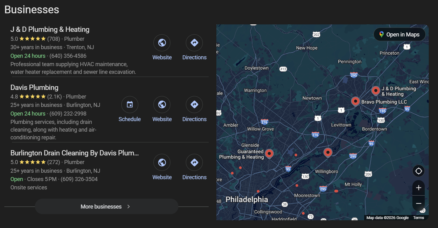 When a customer searches for a plumber, they see two things from you: your Google My Business card at the top with your reviews and rating, and your website ranking below it. That's domination.
